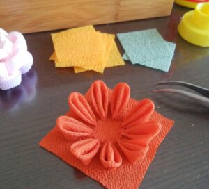薄い布を小さな正方形に切って、つまんで折りたたんで組み合わせて花や葉、蝶や鳥などのモチーフを作る技法です。