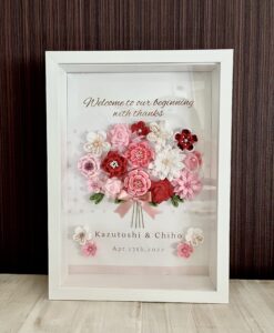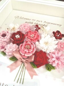 下の画像はA4サイズの立体額装の中央につまみ細工のブーケをあしらいました。