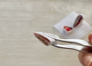 そして2枚を重ねて、上写真のようにもう一度三角に折り、ピンセットでつまみます。