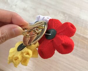 つまみ細工のお花を針金で繋げて土台に固定し、その土台を金具に接着しています。
