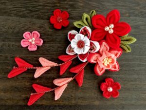 色の組み合わせや、生地の種類によって、様々な表情のつまみ細工を作ることができます。