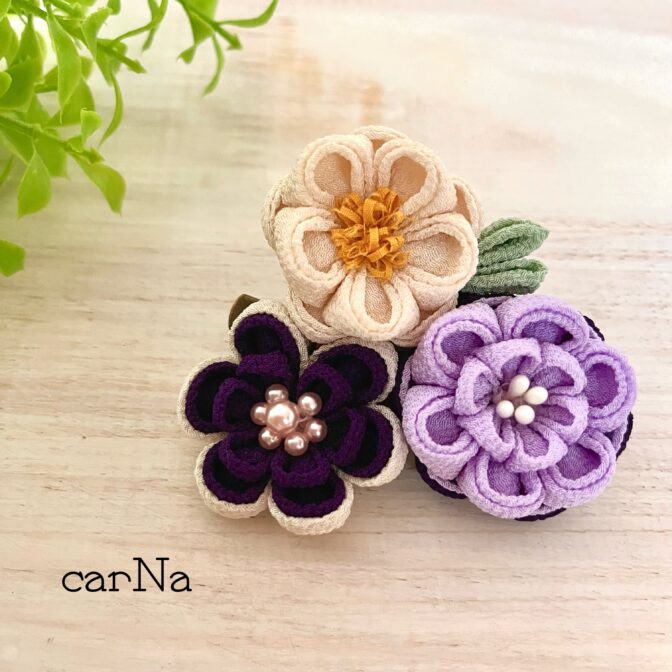 江戸紫・藤色・アイボリーのちりめん生地を使用しています。